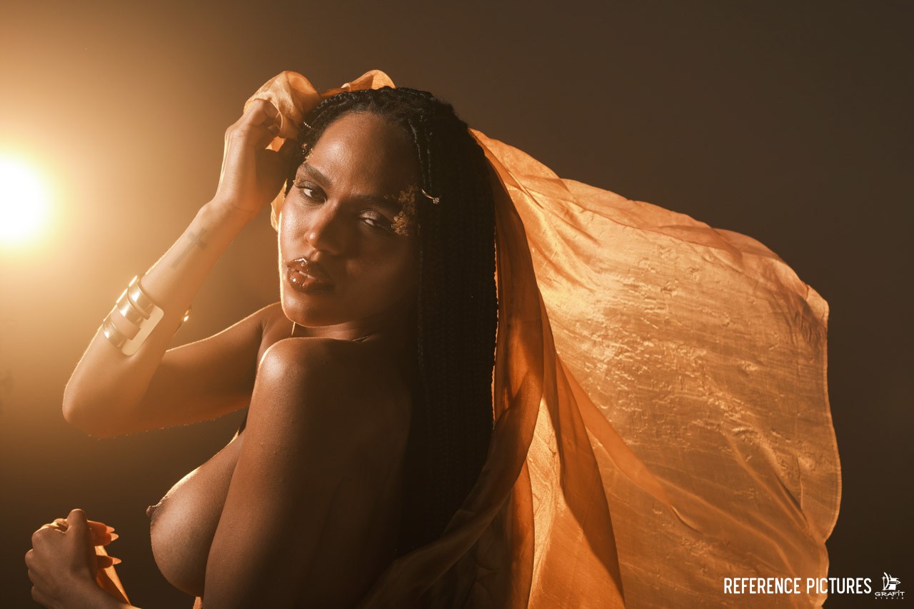 Образы: 1 - высокая причёска с косичками, украшенными бусинами и золотыми лентами; 2 - волосы распущены, лёгкий наряд из тканей, закреплённых на теле, частично закрывающий фигуру. В обоих образах есть кадры ню и варианты с тканями, которые создают ощущение движения.