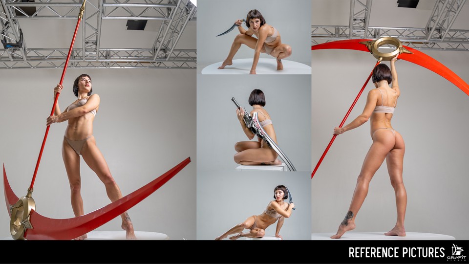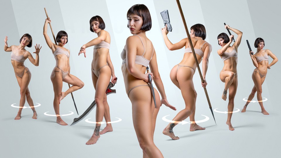 Динамичный 360° градусный референс-пак с яростной охотницей в центре, наполненный позами, заряженными действием. Съёмка на вращающейся платформе и чистый студийный свет позволяют рассмотреть каждое движение со всех ракурсов, улавливая баланс, работу с оружием и полную механику тела.